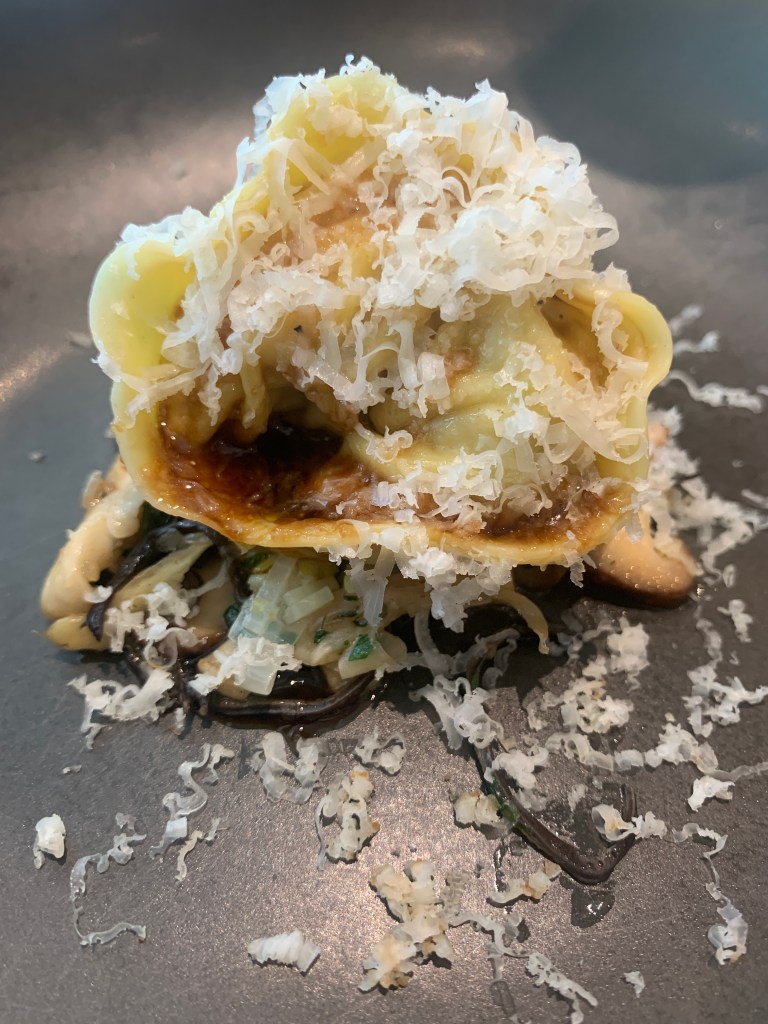 Brisbane Valley Quail Tortellini. Sauteed mushrooms, leek, truffle pecorino.
