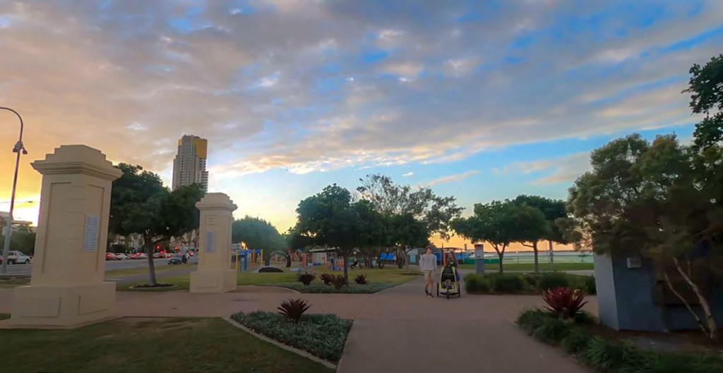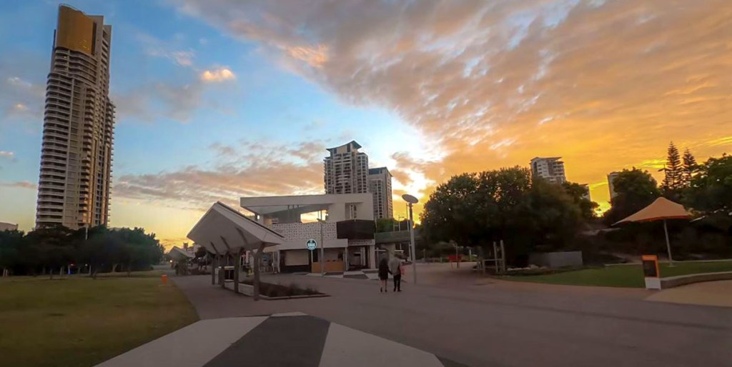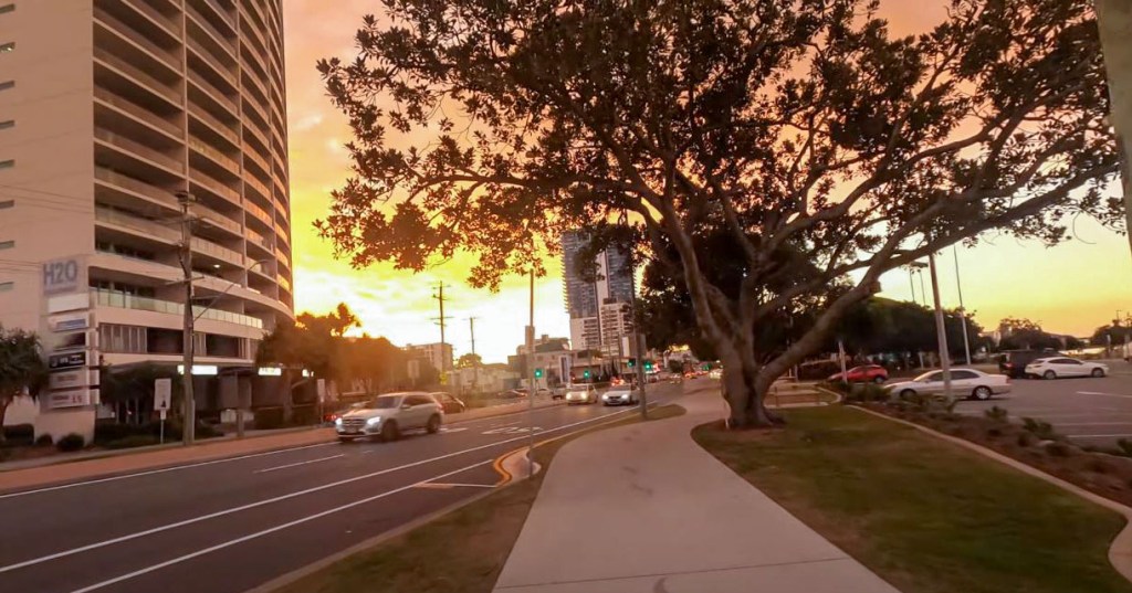 As winter edges towards spring, the evenings on the Gold Coast are excellent for walking. Not hot and as the sun goes down quite visually striking.