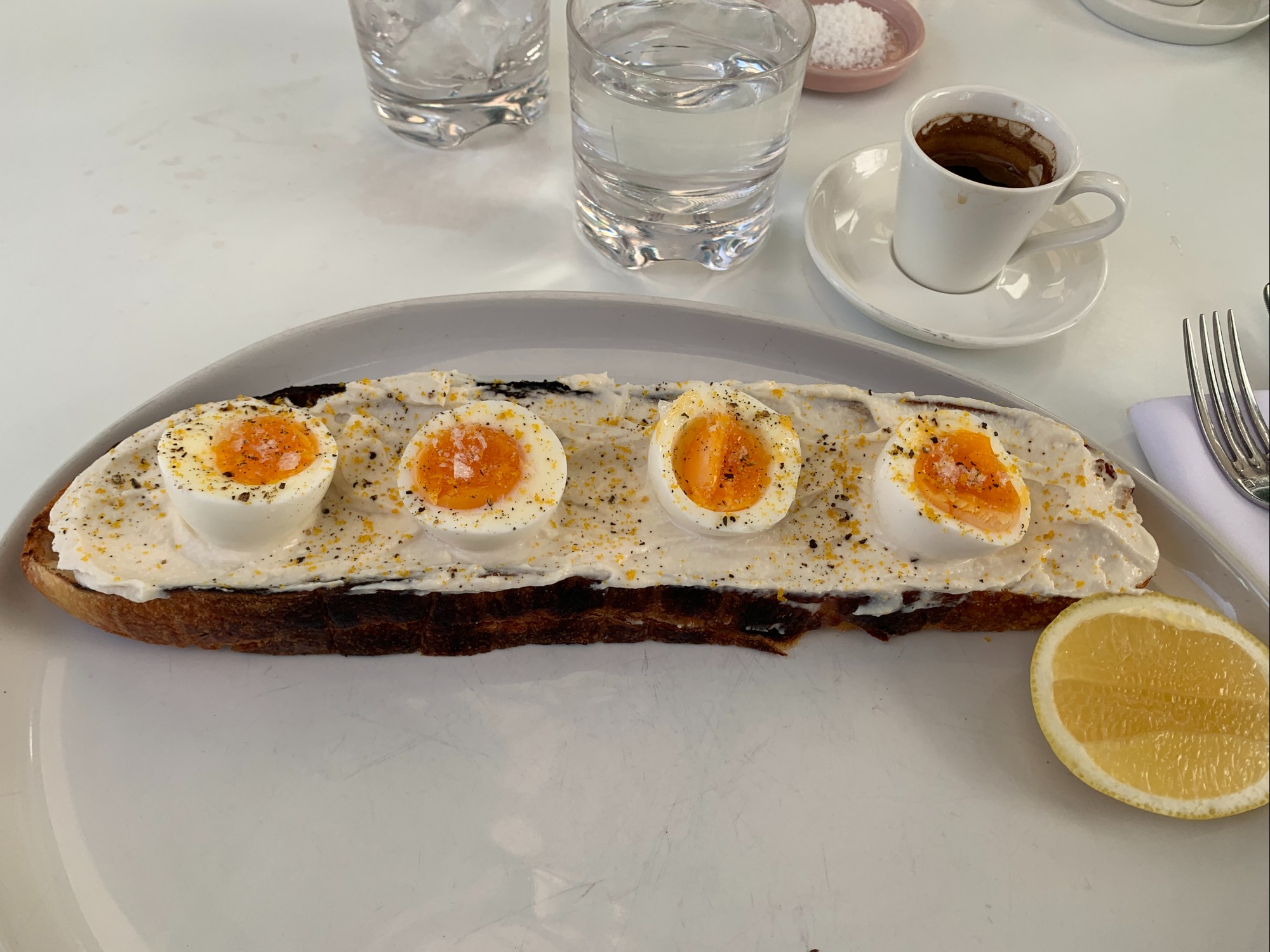 June 20, 2021July 29, 2021 Breakfast at Hellenika EGGS WITH EGGS WITH EGGS Boiled eggs, taramosalata, bottarga & toast Greek coffee Share this: Share on X (Opens in new window) X Share on Facebook (Opens in new window) Facebook Like Loading... Related