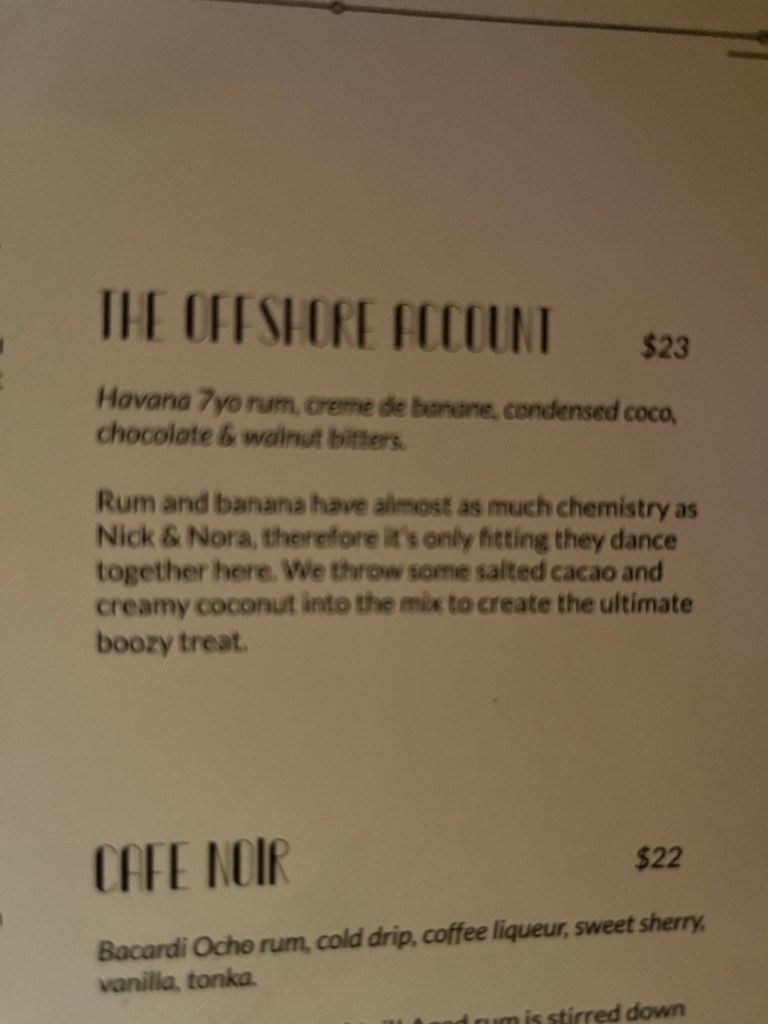 October 22, 2022October 28, 2022 Nick & Nora’s – Melbourne Never one to disappoint. First, a delicious Off Shore Account Yum Can’t go past a crab roll either Share this: Click to share on X (Opens in new window) X Click to share on Facebook (Opens in new window) Facebook Like Loading... Related